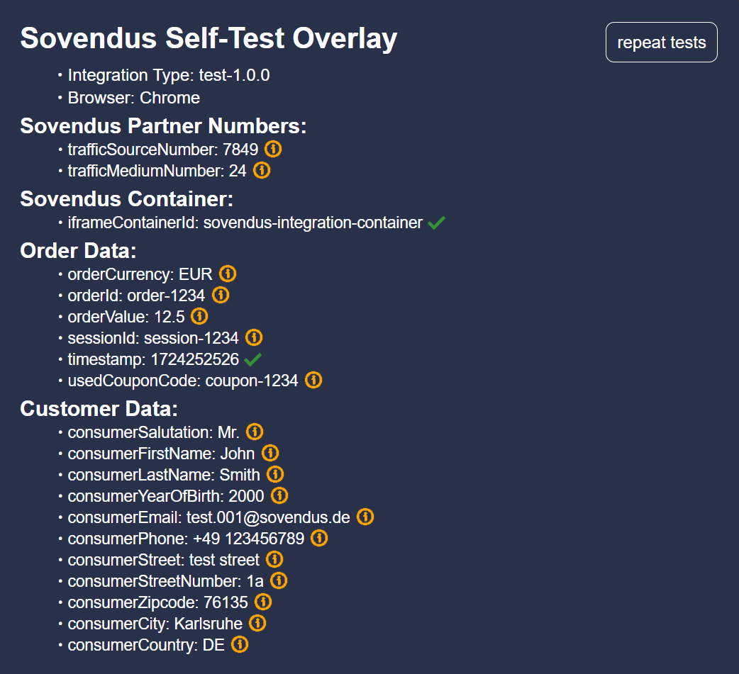 If there is a trace of our integration, the self-test overlay will open automatically on the page, displaying all order, consumer, and integration information.